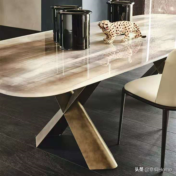标志性的金属底座就像雕塑一样引人注目,天然纹理的大理石桌面。