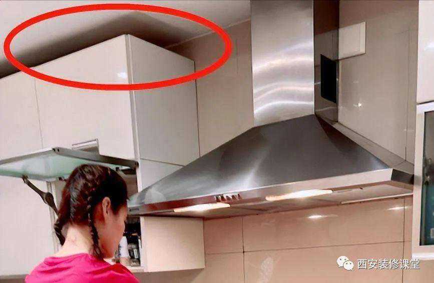 ▲隐藏烟机需要注意,想要烟机安装完毕与吊柜严丝合缝没有缝隙,一定要把烟机位置的吊柜柜体上缩2~3cm,柜门不缩,这样安装完毕就是严丝合缝,而且预留的空间后期可以方便烟机拆卸。《烟机与吊柜有缝隙太难看,一招解决》