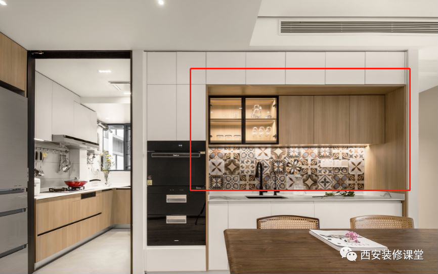 ▲如果是厨房空间,因为无法做成薄厚不一的吊柜,无法改变形式,此时可以如上图的做法,封闭和镂空结合的形式,来弱化因为层高过高吊柜太压抑的问题
