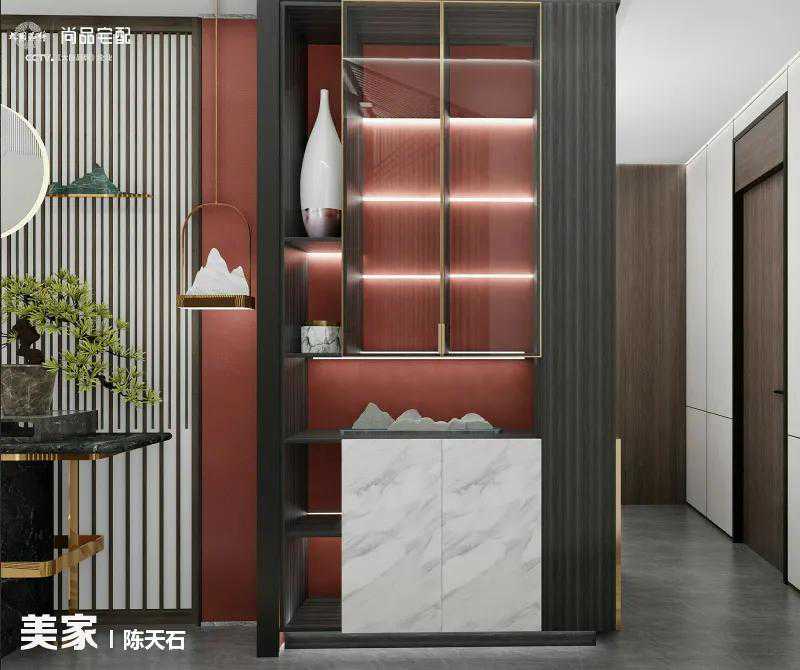 这套“暮雪江南”以徽派建筑、枯枝山水为灵感发源,将江南风景融于中式设计,清雅大气。门厅与会客室使用了颜色鲜亮的宫墙锦红做主色调,用了较多格栅在不同的角度体现虚实,斜顶和留白营造出江南秀丽。