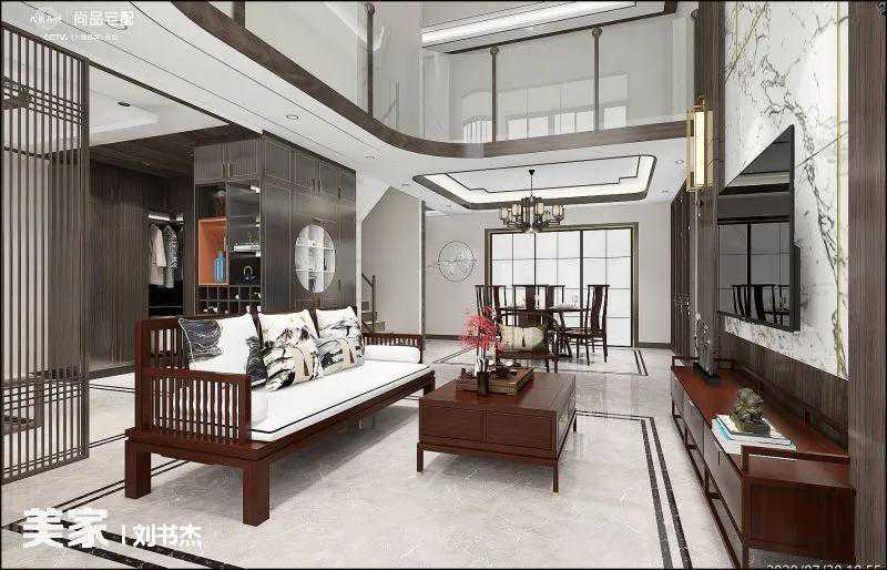 跃层户型打造新中式风格,布局上将中式元素和现代材质巧妙兼揉,框景、漏景、对景和移步换景的表现手法也能得到阐释。