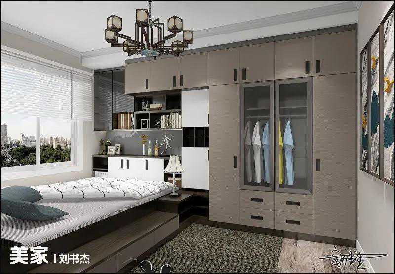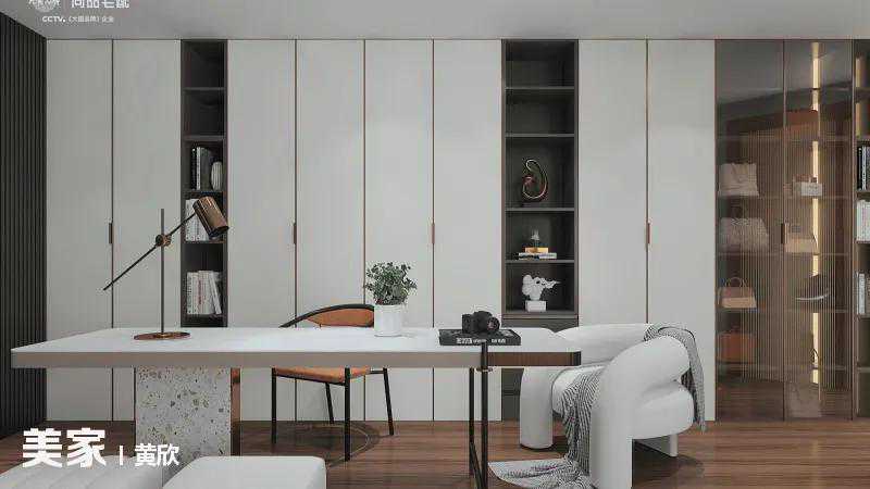 客餐厅之间用金色边框玻璃隔断,不会影响采光;衣柜侧边设计开放层板,能收纳能展示。