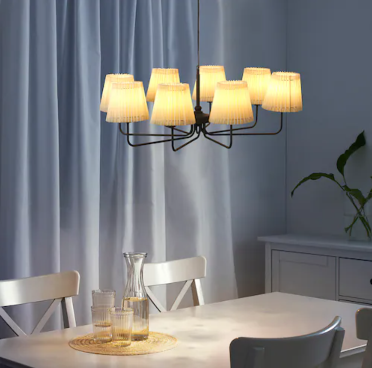 8个布艺灯罩组合成的枝形灯,造型优雅而浪漫。