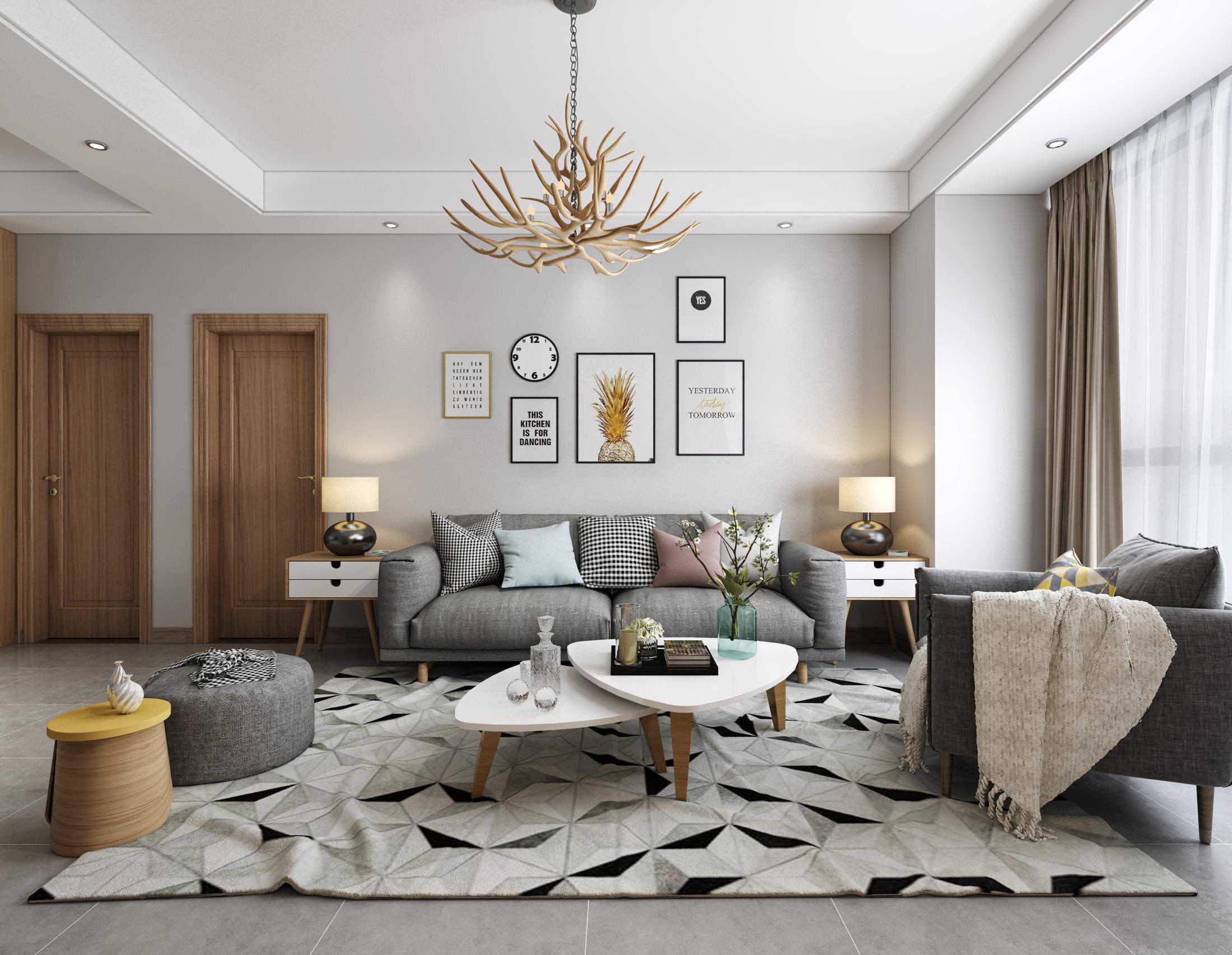组合沙发指的是房间内有多个沙发,每个沙发的方向都不同。组合方式多种多样,常见的有“1+2”“2+3”“1+1+3”“1+2+3”等。这里的“1”,可以视情况选择单人位沙发、长凳或者是椅子;“2”和“3”均指的是双人位沙发和单人位沙发。