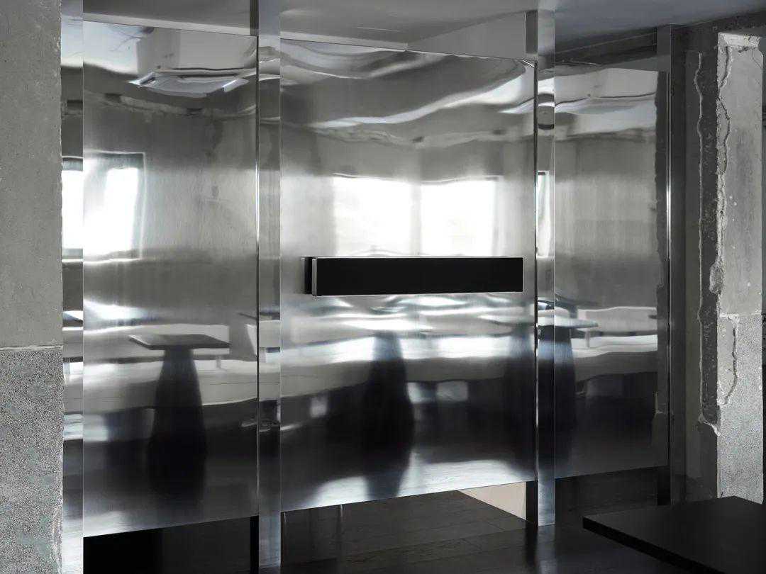 不锈钢(经过抛光处理)中央隔板用于分隔运动线,反射光线并投影在主墙上,以更生动地呈现所要传达的图像。此外,所有引人注目的家具都散发出一种整体的大众感,受到野兽派建筑的启发。