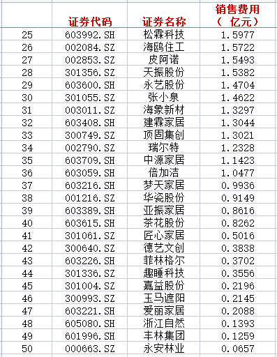 基于此,观察者网以2022年财报数据为参考,对50家A股上市家居企业的相关数据进行了统计。其中,销售费用少于1亿元的有14家企业,销售费用介于1亿元至10亿元之间的有28家;销售费用高于10亿元的有8家。