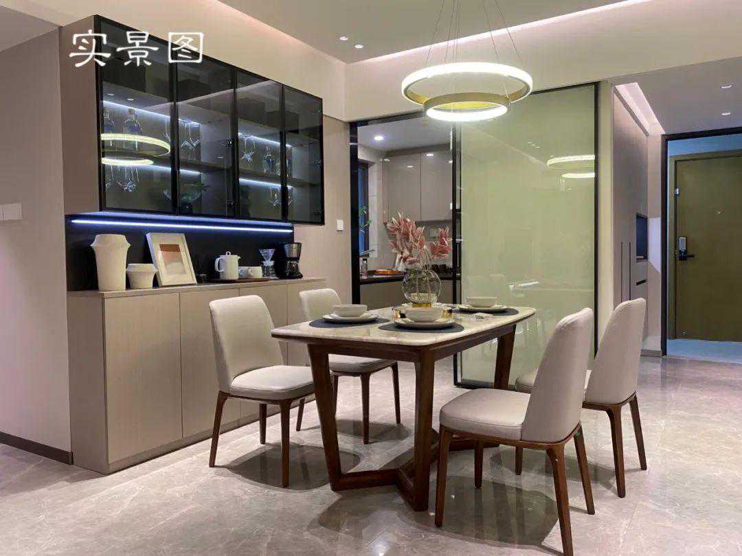 对称化的餐边柜倍显简洁舒适。宽阔台面,可以摆放热水壶、电饭煲等家电,方便存取;而上方大片的橱窗亦让空间在视觉上更为宽广;下方则是封闭储物区,多元化空间利用,存放有序。