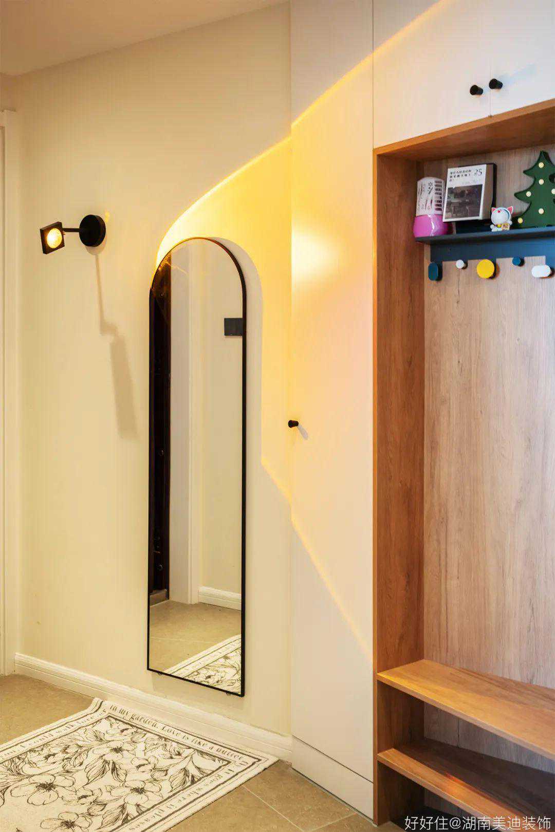 入户的镜子不仅能够整理仪表,还能够制造出一定的反射效果,瞬间令视觉范围扩大一倍。打开暖黄的日落灯能立刻为空间注入活力,感受到家的归属感。