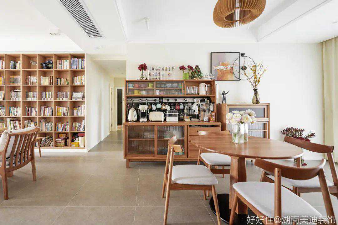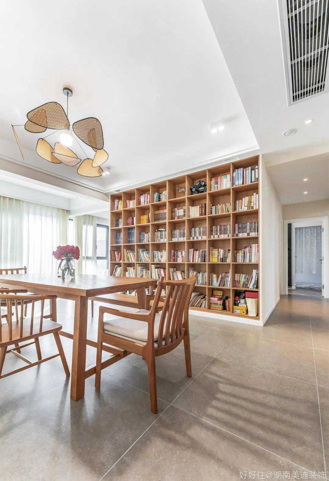 这套153㎡的房子位于湖南长沙,屋主是一对90后的小夫妻,希望回到家能让人感到放松和舒适。设计师舍弃传统的客厅布局,添置了一整面书柜,打造了开放式的阅读区,并增添了投影来代替电视,一家人围坐在大大的木桌看书、聊天,享受自在的家庭时光。