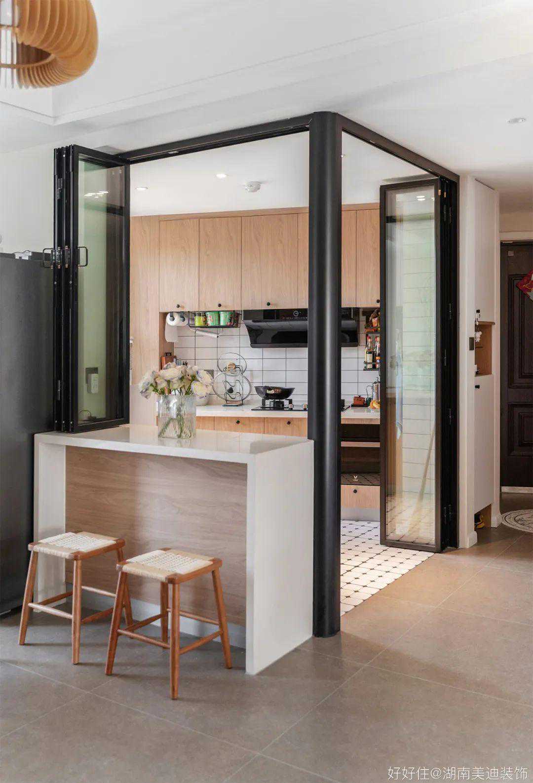如果你不喜欢一板一眼的设计风格,可以尝试用半开放式的厨房点亮空间气氛。吧台桌的隔断时尚而温馨,不仅提升了功能性,还使空间有了更好的延续性。