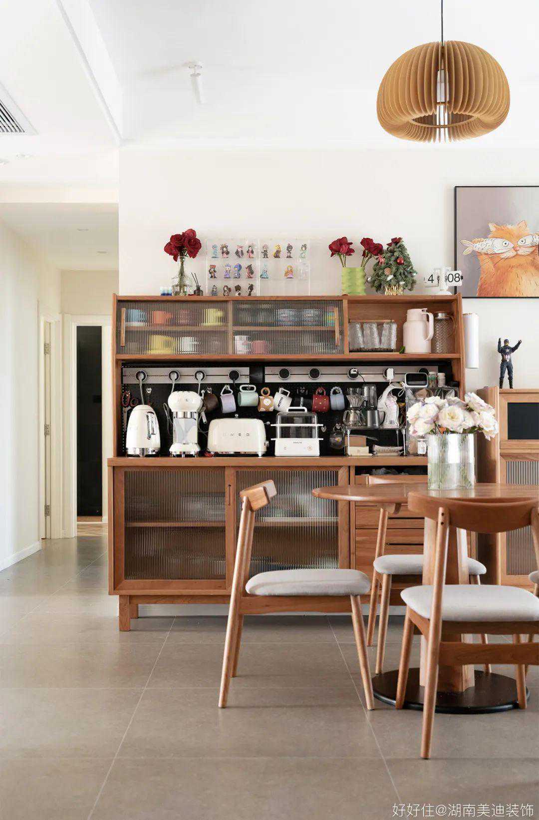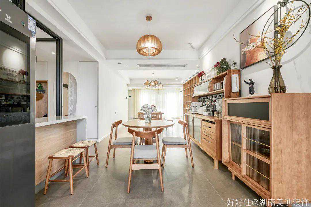 餐厅宽敞自如,不同功能之间奇妙地自我调适,协调兼容,并且极大地扩容了家的视觉面积。