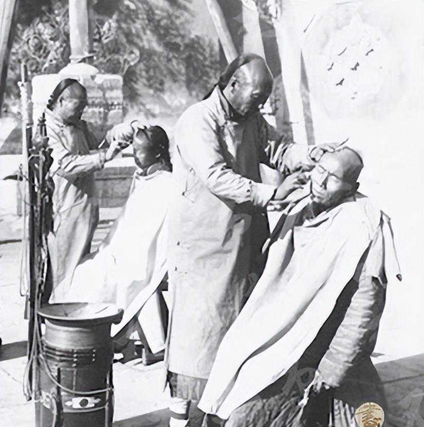 17、一位男子坐在椅子上,剃头匠为他编辫子,同时看报纸。-副本