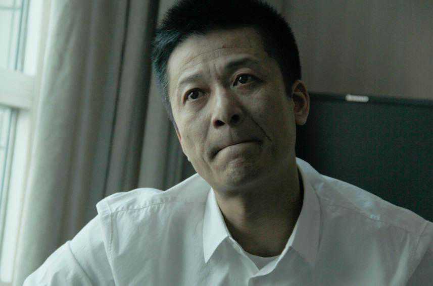 想起已故的父亲80岁冥寿,束昱辉穿着灰色西装,跪在灵牌前痛哭。