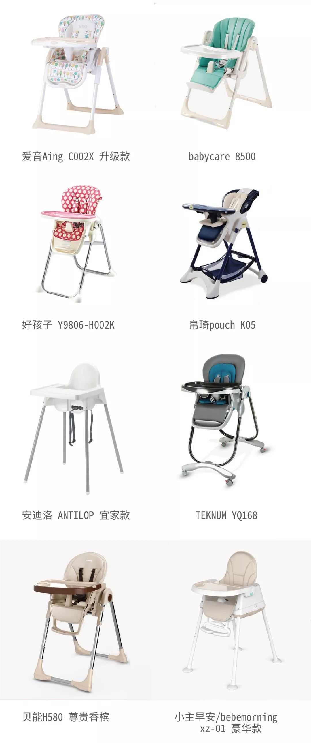 基于上述对儿童餐椅材质与性能的考量,并且根据电商平台销量,小红花测评选择了6款“塑料+金属”制成的折叠式儿童餐椅,还把某宝上销量极高的一款——“小主早安xz-01”以及网红“宜家款”一并纳入到此次的测评样品中,请大家认准品牌型号噢~