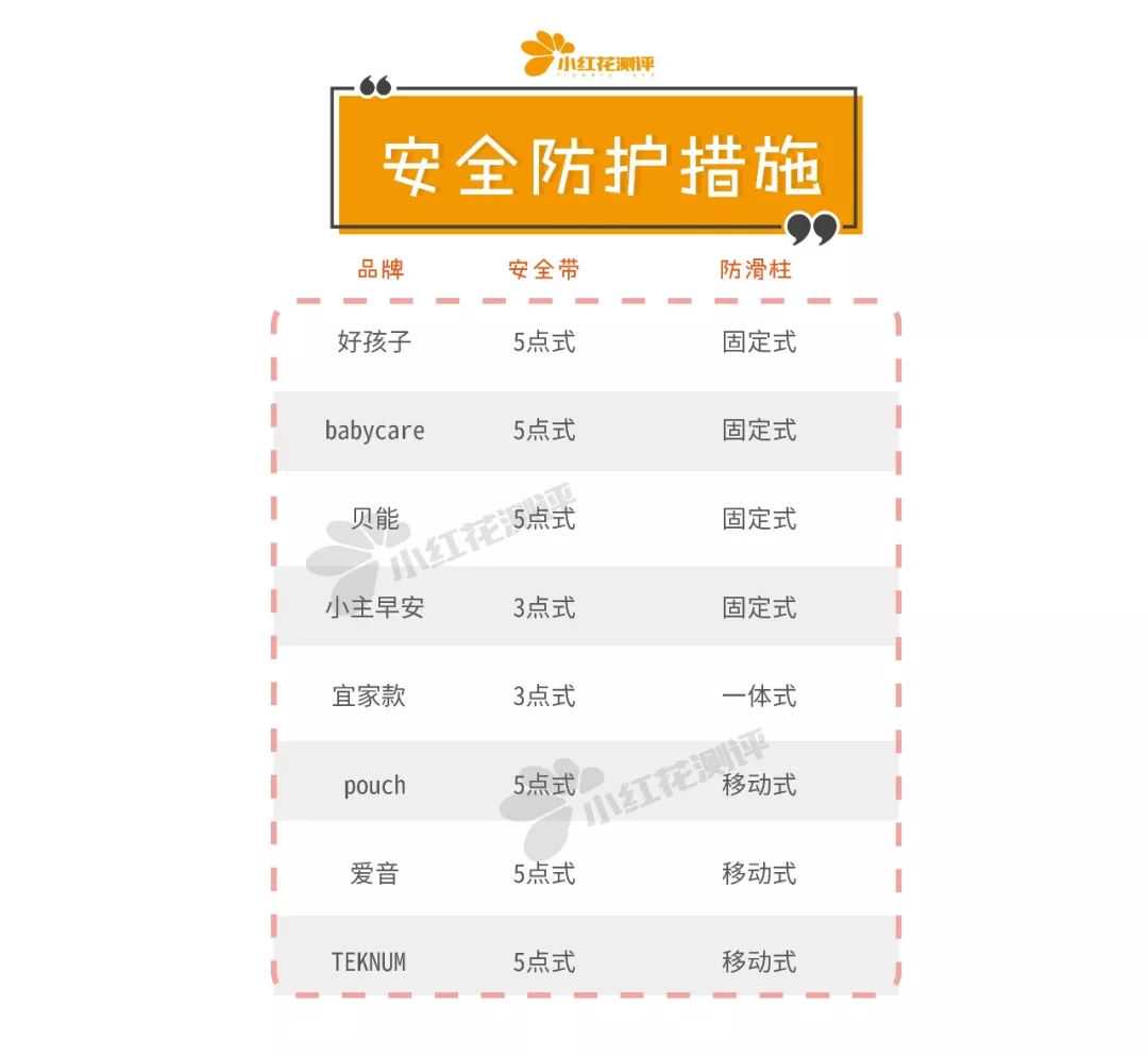 “好孩子”、“babycare”、“贝能”均为五点式安全带+固定防滑柱,安全防护措施最佳。