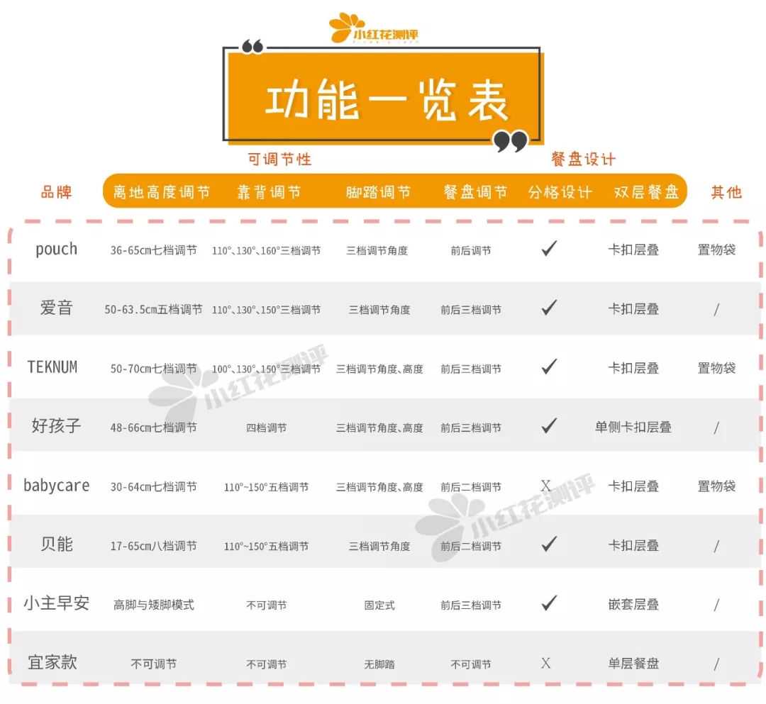 为了方便各位宝爸宝妈们比较,贴心的小红花测评已经将各款餐椅的各项“技能”一一列举。