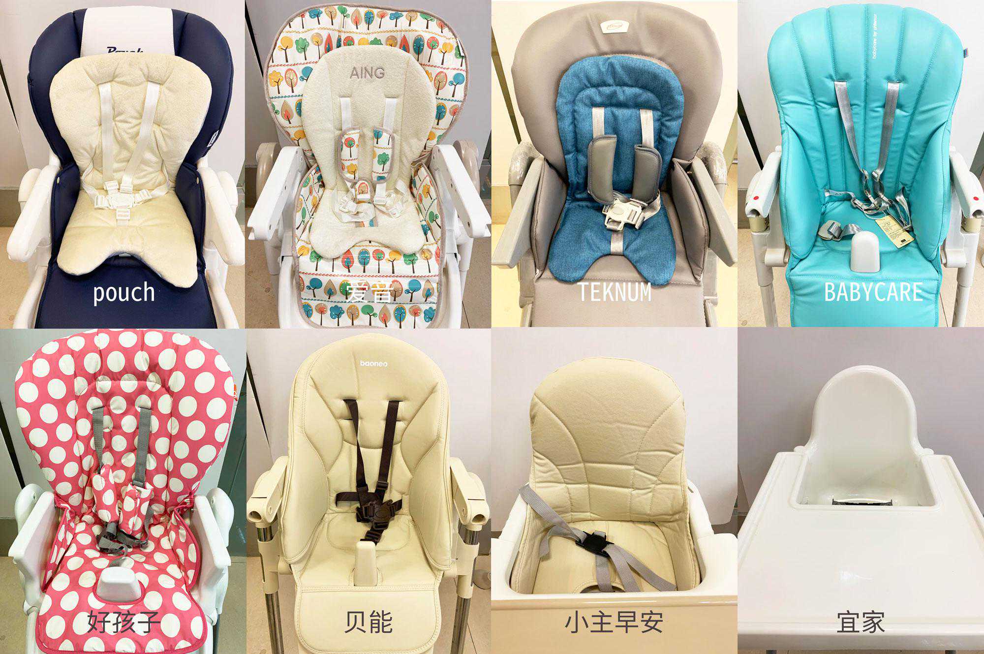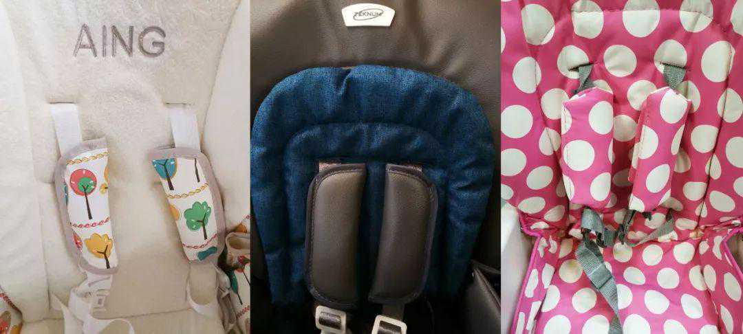 8款餐椅中,“爱音”、“TEKNUM”、“好孩子”在安全带肩部的受力点处设置了防护垫,值得加分。