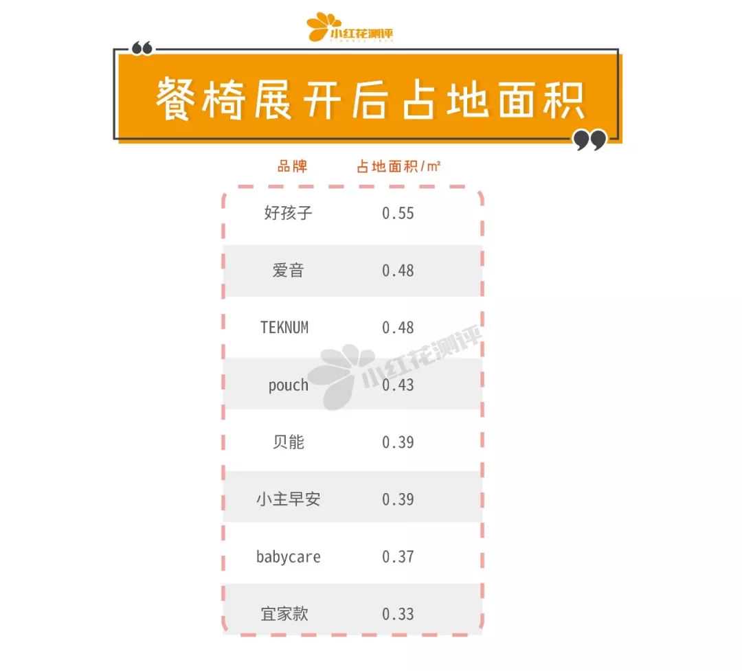 小红花测评测量了各款餐椅椅脚撑至最大状态的长度和宽度,计算出它们完全展开后的占地面积,如下图所示: