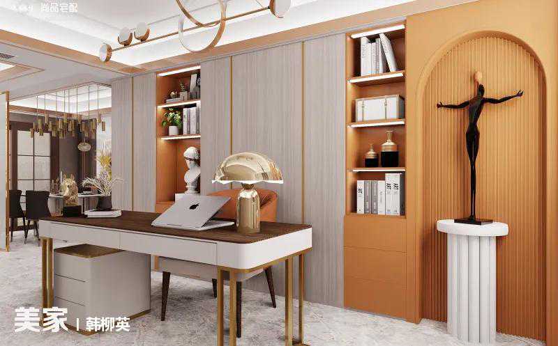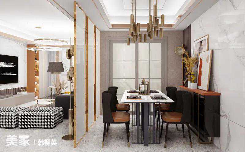 喜欢华丽的轻奢风,自然少不了金色和爱马仕橙的点缀。背景墙、柜门、餐椅、抱枕都运用上,轻奢的感觉油然而生。