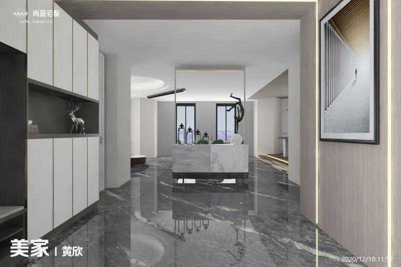 这套“暮雪江南”以徽派建筑、枯枝山水为灵感发源,将江南风景融于中式设计,清雅大气。门厅与会客室使用了颜色鲜亮的宫墙锦红做主色调,用了较多格栅在不同的角度体现虚实,斜顶和留白营造出江南秀丽。