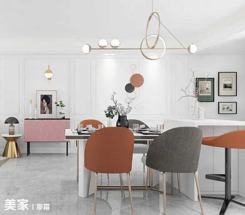 空间整体色彩搭配丰富有层次,客餐厅用大面积的白色奠定简约基调,家具软装上则采用橘红、珊瑚粉、橙色等明亮色做点缀,加上金属、大理石等轻奢元素的运用,给人一种热情活力的感觉。
