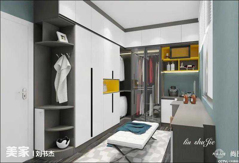 客餐厅之间用金色边框玻璃隔断,不会影响采光;衣柜侧边设计开放层板,能收纳能展示。
