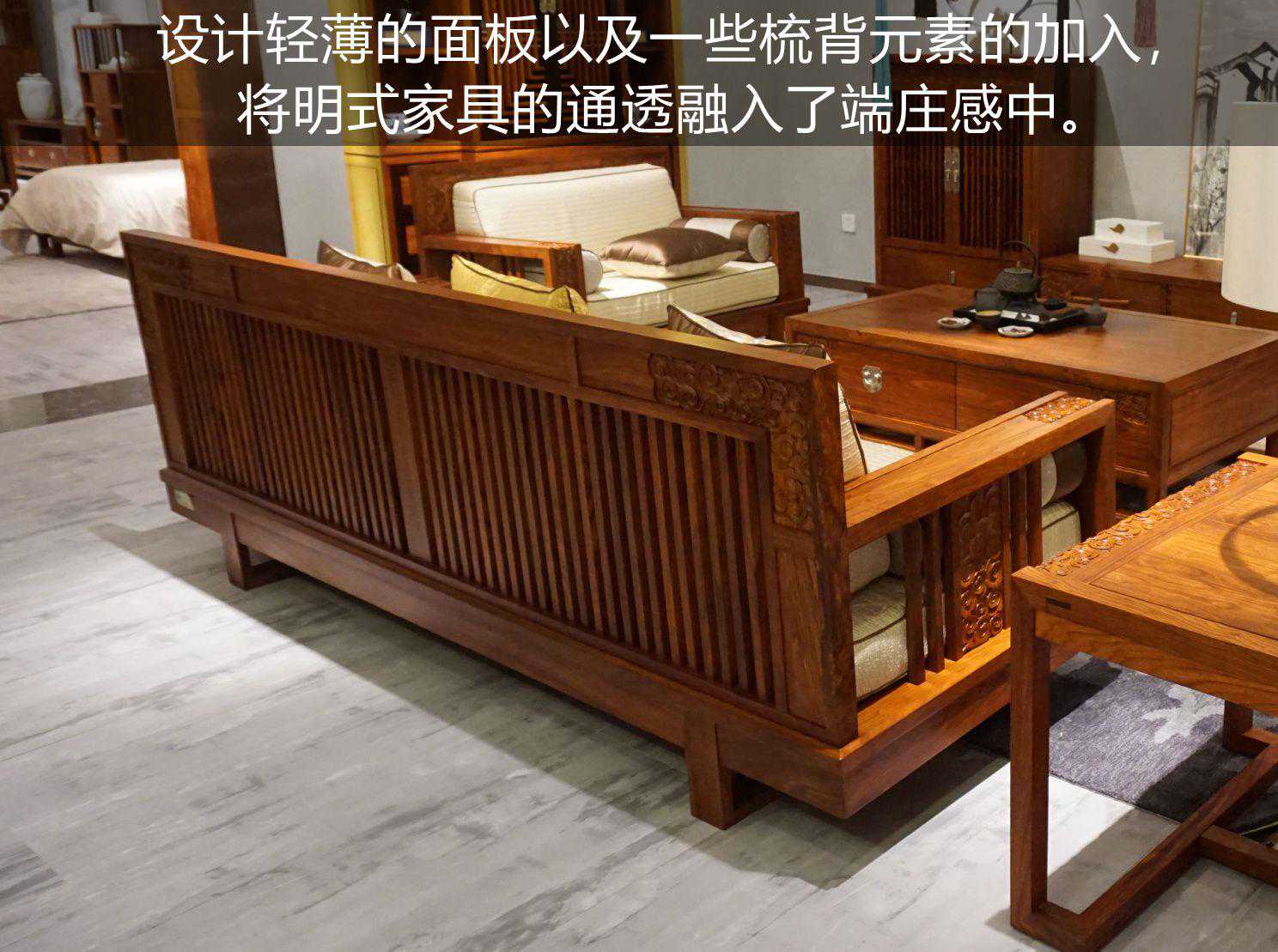 靠背加厚到与实木框架接近1:1的程度,把空间尽量填满,让沉稳的感觉更为突出。同时,平衡了乌金木的高调感,不会过于浮夸。