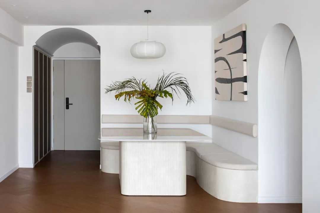 在这个极简摩洛哥风格家居中,餐厅长凳的流畅性平衡了墙壁上的图案线条,同时也呼应了走廊和门厅处的拱形设计。