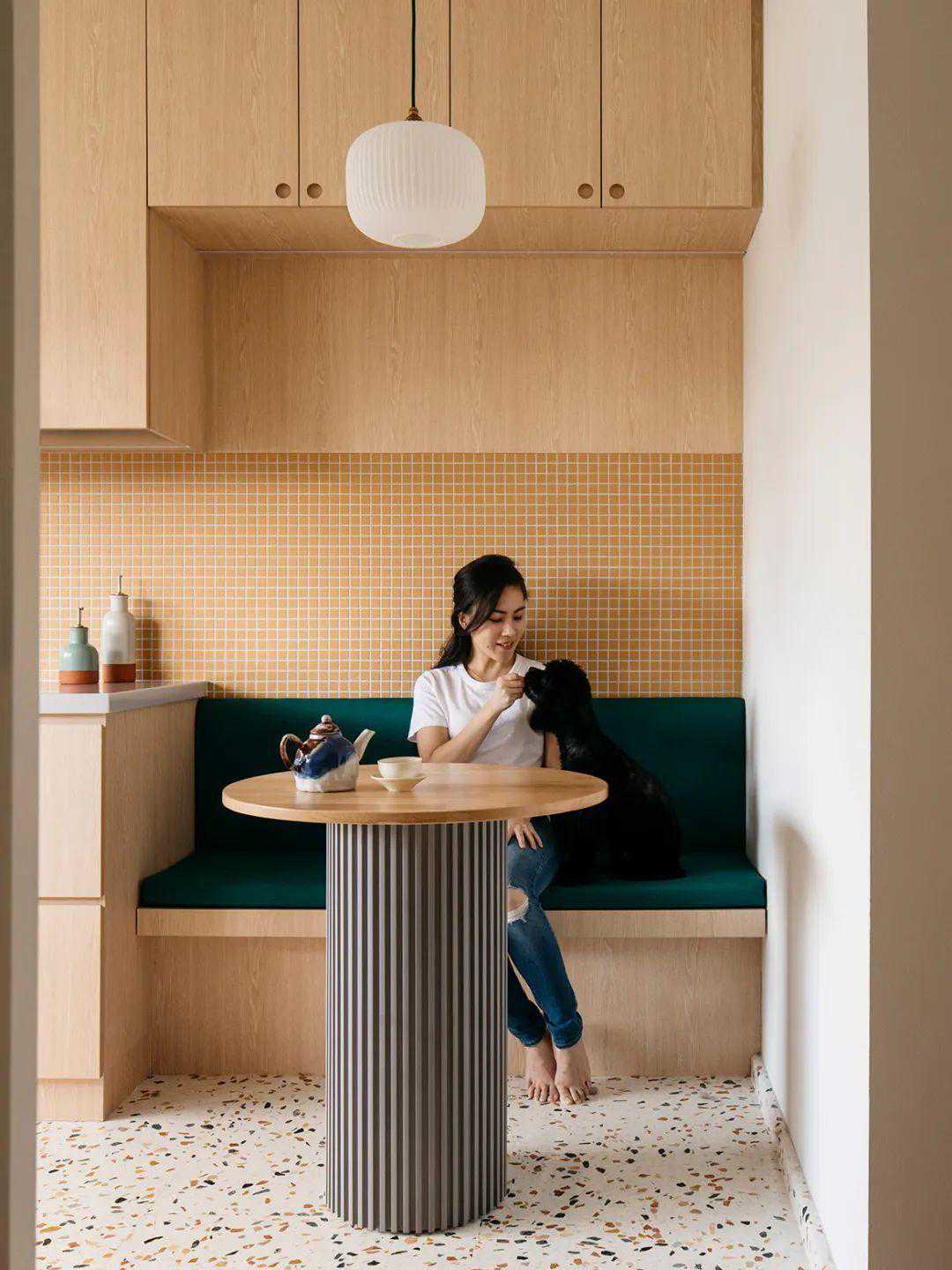 有一些小户型住宅放不下餐桌。在上图中,半高L型长椅作为厨房与客厅的分割,还围起了摆放餐桌的位置,长凳的靠背还可以作为岛台。
