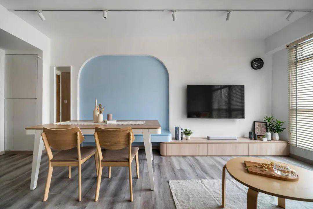 上图餐厅的设计以淡蓝色的略微凹陷墙壁为特色。在整个中性色调的客厅背景下,这一抹蓝色成为了房间的焦点,独具特色。
