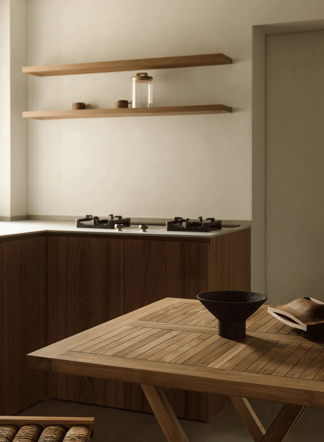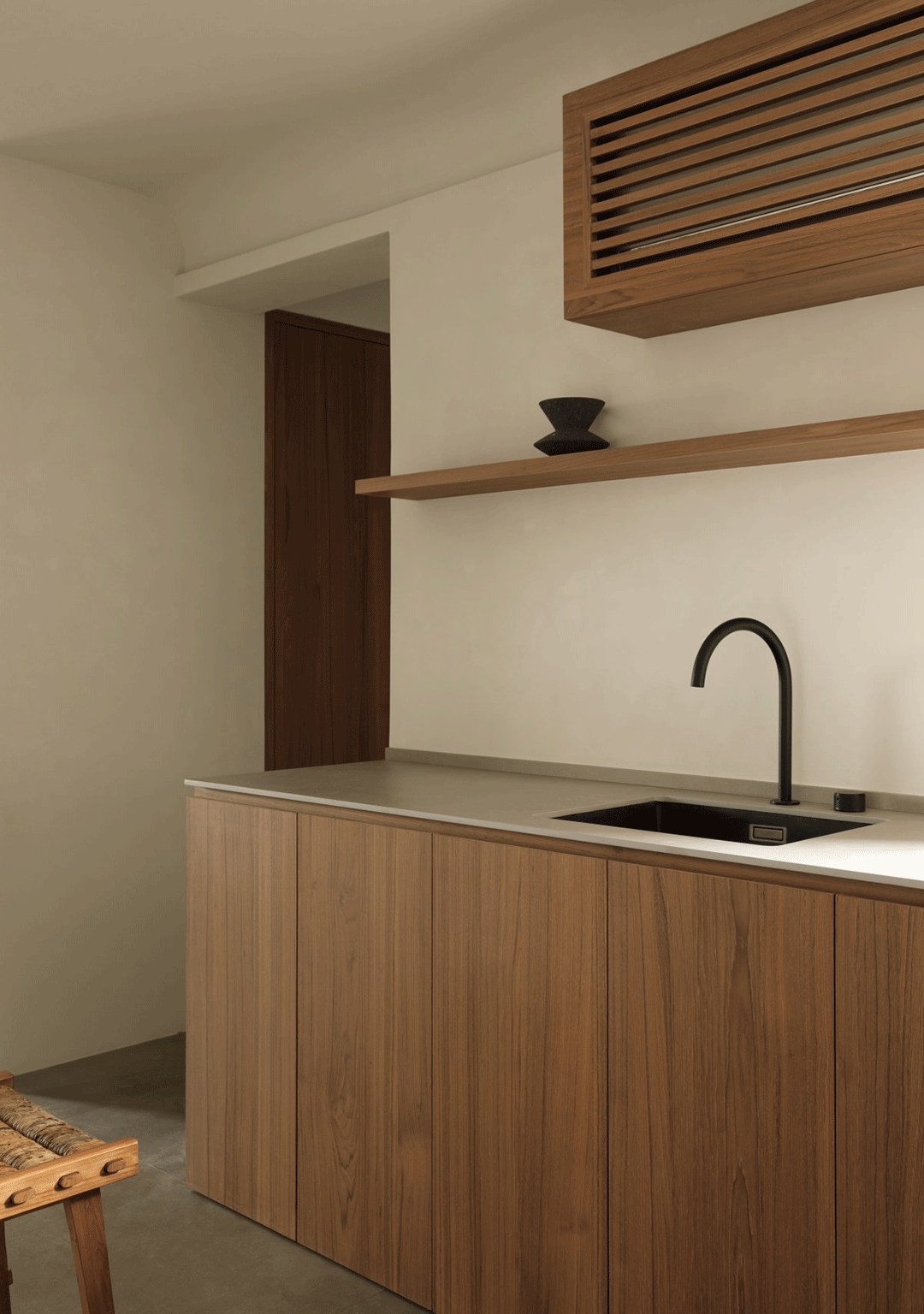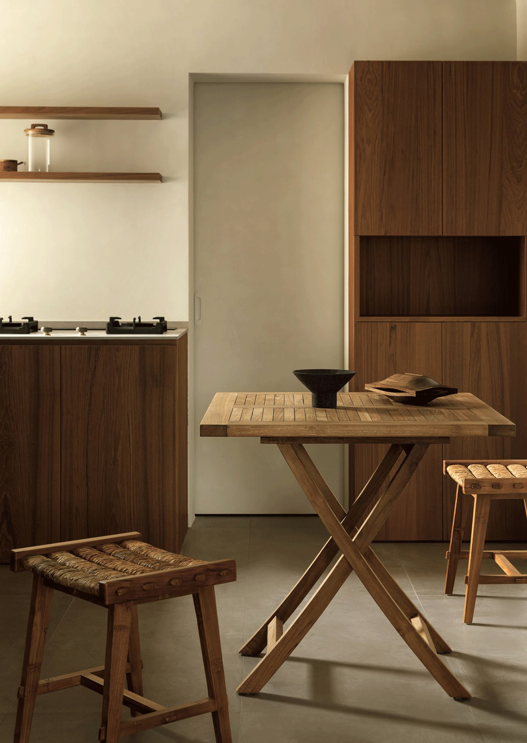 精心选择的材料如柚木、水泥砖和艺术涂料等自然肌理材质,强调了原始材料的质感和自然之美。