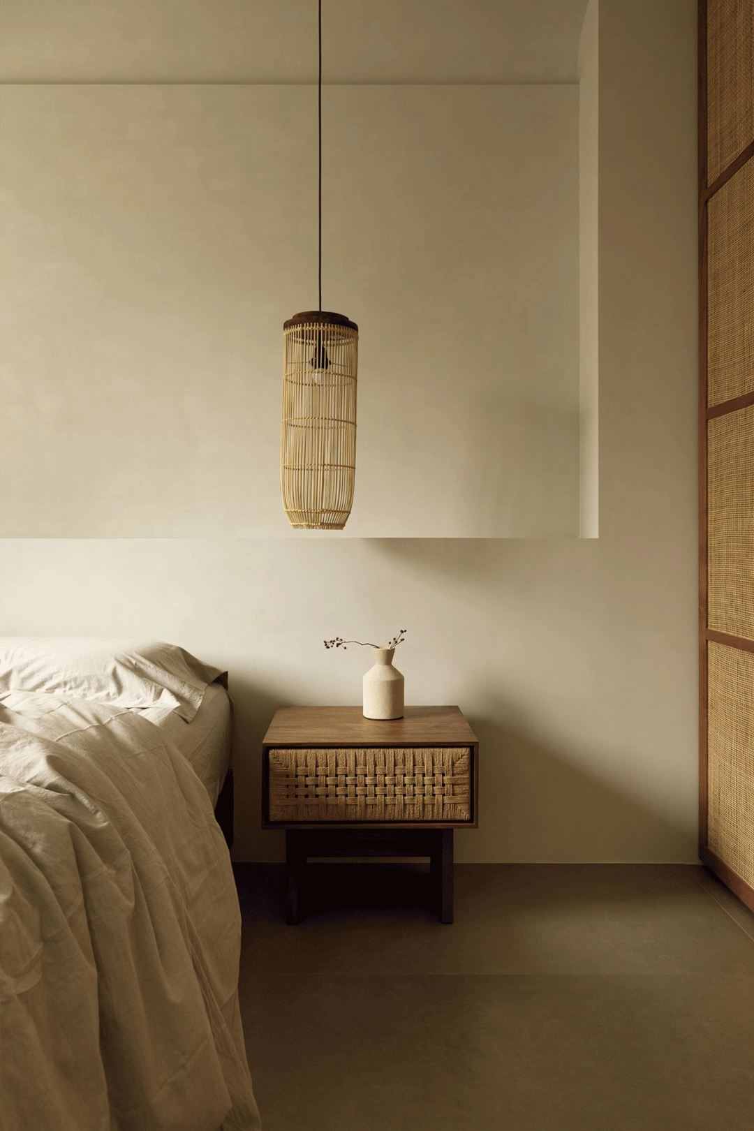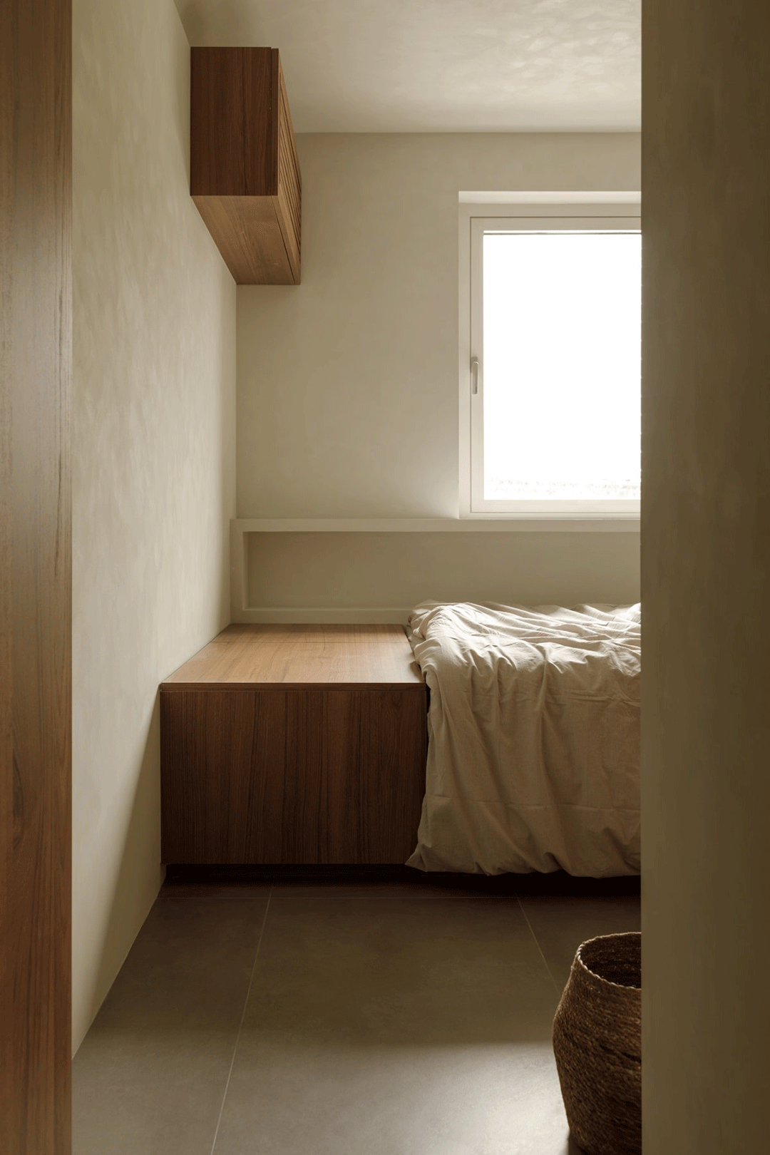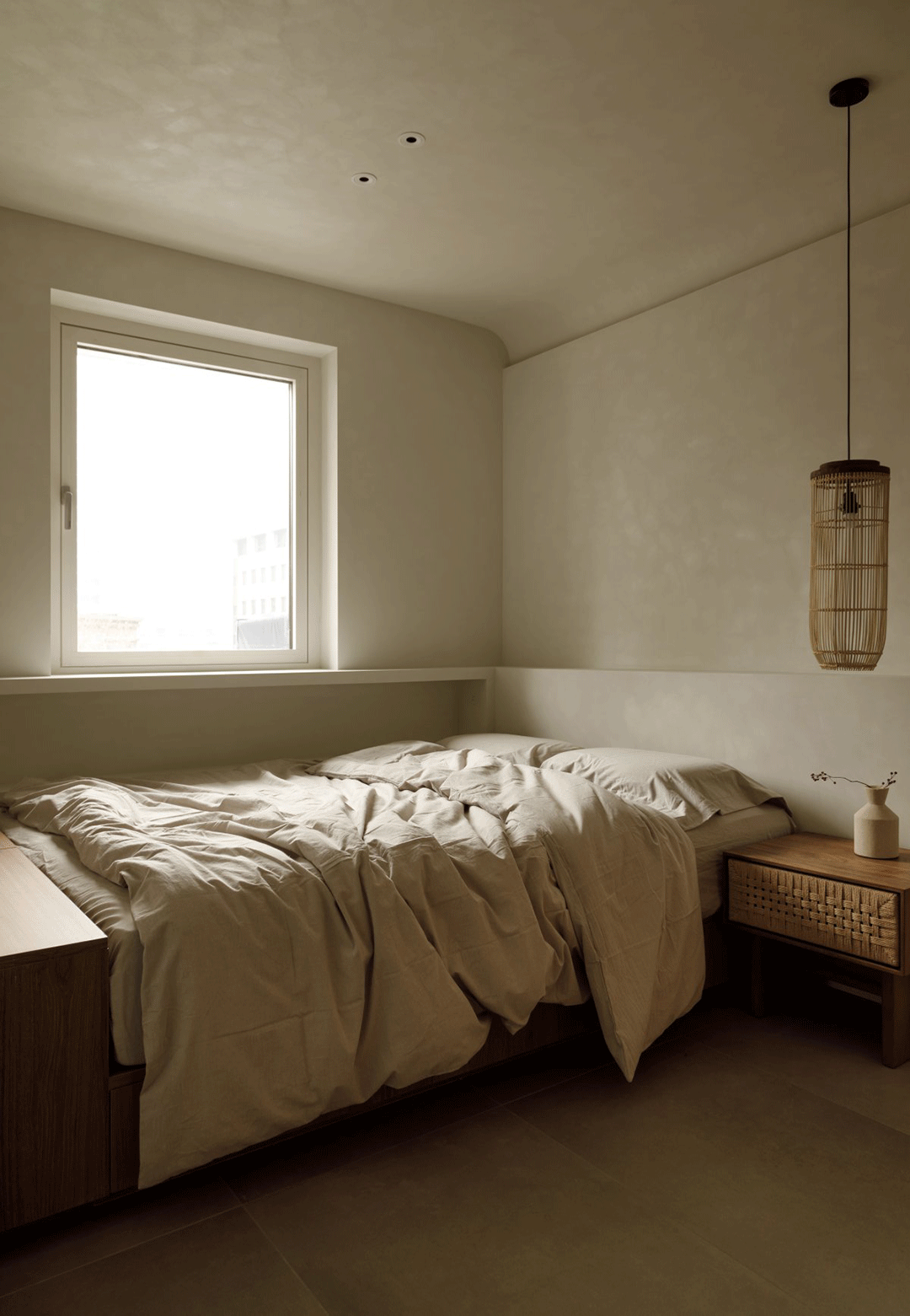 外置的原石洗手台增加自然的感觉;主卧沿用了自然的元素,棉麻感的壁布作墙面,设计了地台床的形式,温馨舒适。