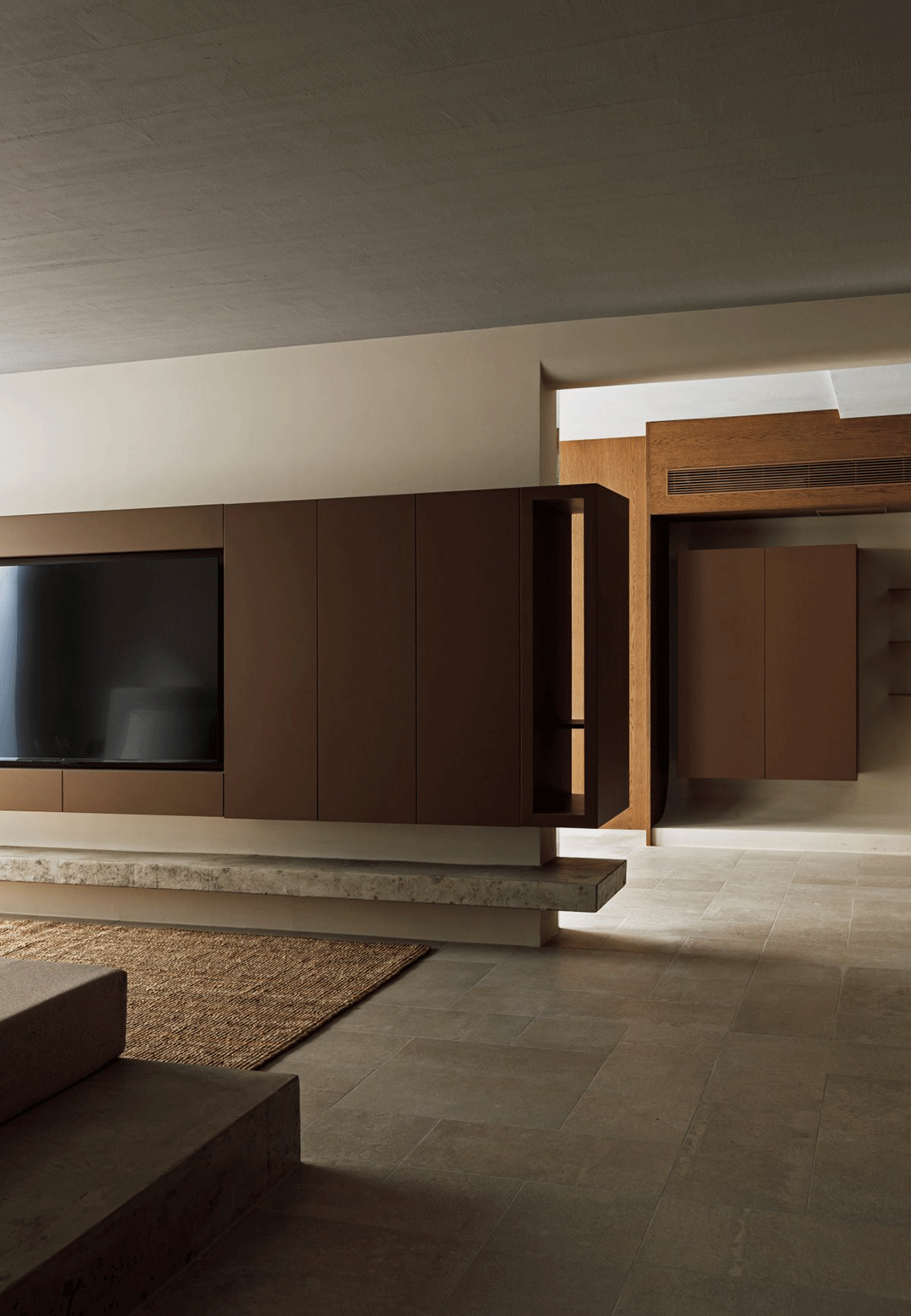 柚木和水泥砖的自然质感与艺术涂料的独特纹理相得益彰,让空间充满生活的味道。这些材料不仅体现了极简的设计理念,更让业主感受到自然之美和生活的舒适。