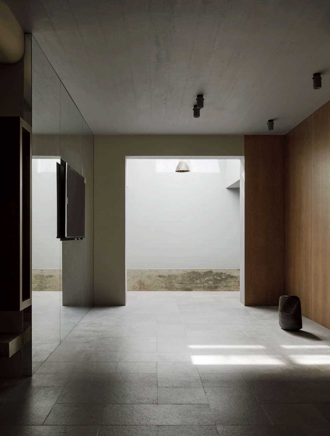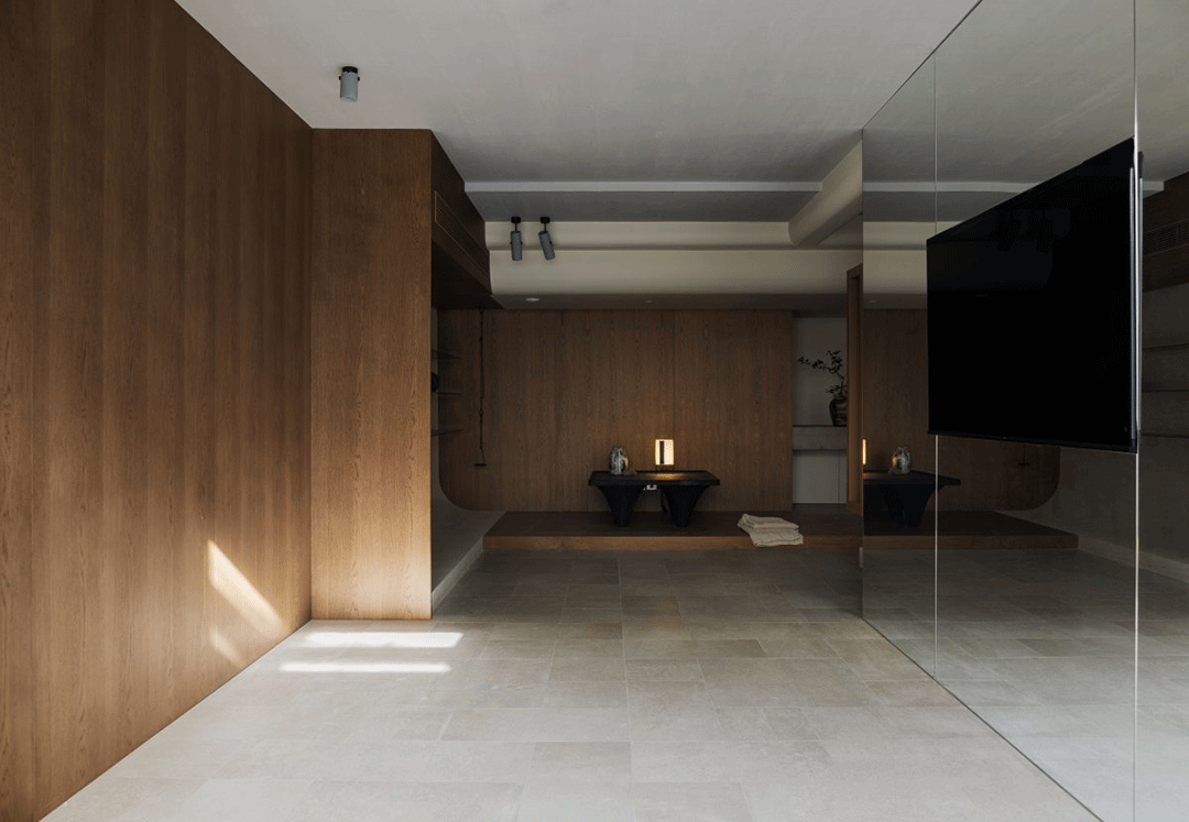 屋主健身区域,大面积的镜面满足健身需求同时增加了空间的进深感。清水混凝土浇筑的楼梯,自然成景的一角,彷佛一个独一无二的装置置入空间。