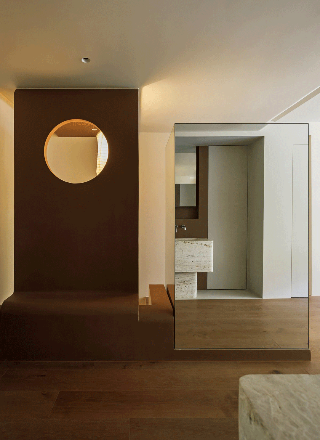 虚实的结合,造型独特的换鞋凳也是入户的玄关置景,又是楼梯口的安全遮挡。镜面的盒子内藏冰箱的同时也是入户的穿衣镜,我们希望屋主回家总有一盏温暖的灯等着她。