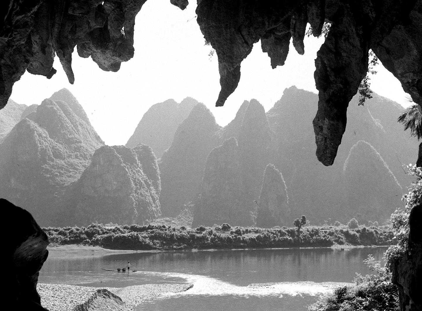 1961年,从漓江岸边的冠岩洞口,远望对岸峰峦。
