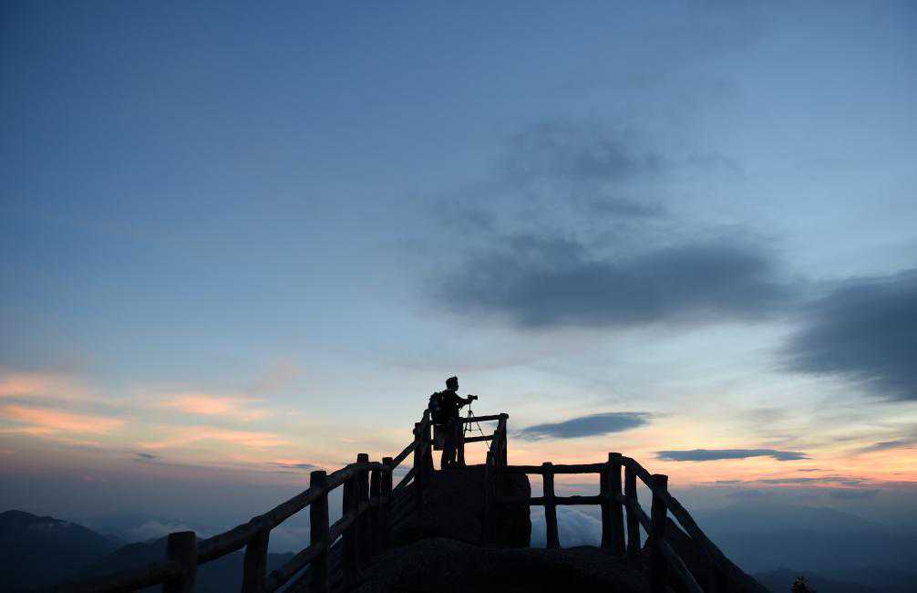 2014年9月2日,在猫儿山山顶“华南之巅”观景台上,一名游客在拍摄落日。