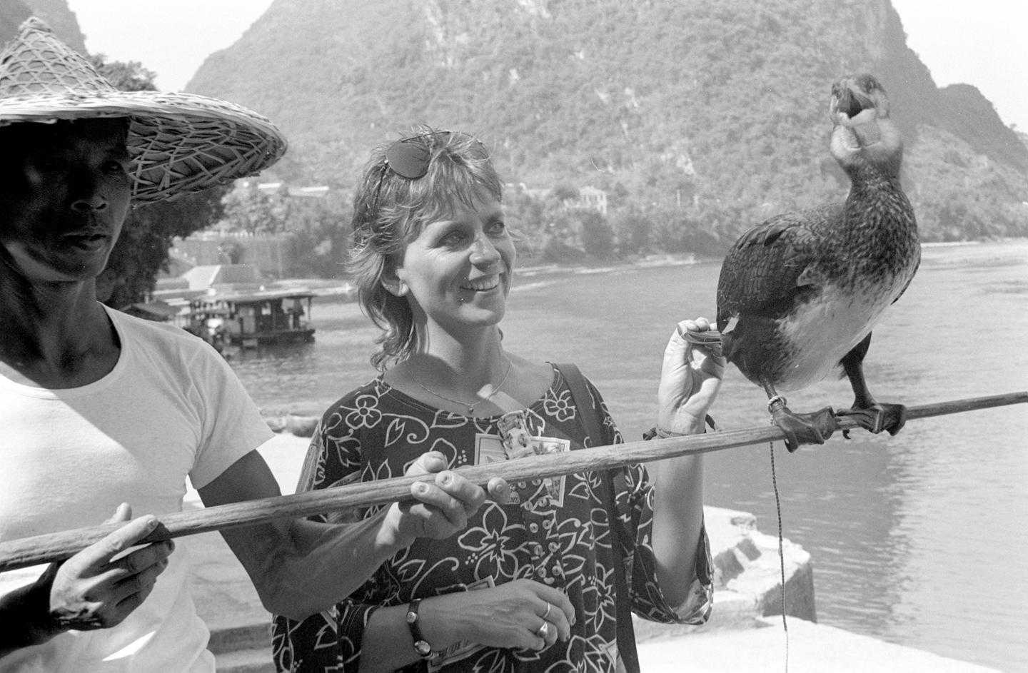 1986年,外国游客同漓江渔民及他的捕鱼鸟——鸬鹚合影。