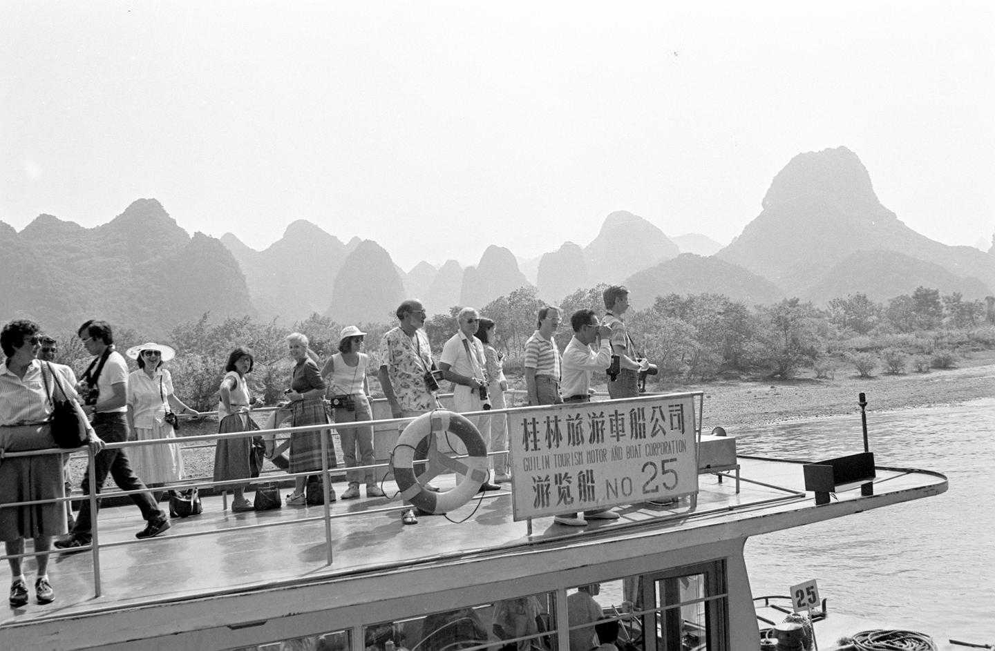 1984年,外国客人乘坐漓江航运公司的游船,欣赏漓江两岸的景色。