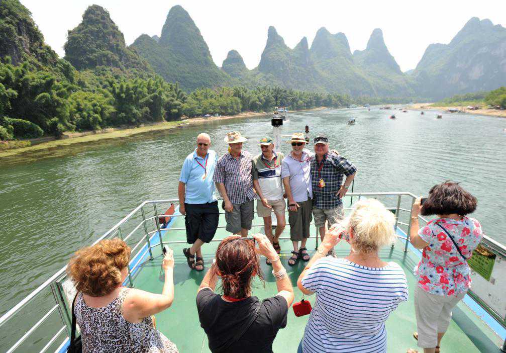 2012年9月2日,几名外国游客乘船在桂林漓江阳朔河段游览观光时拍照留念。