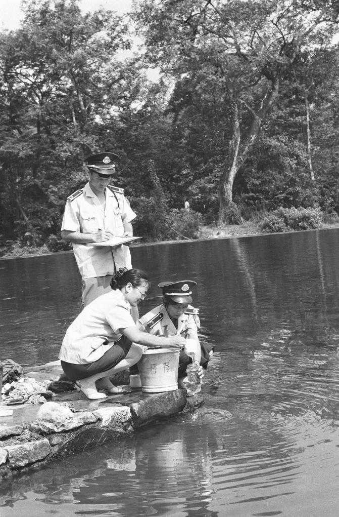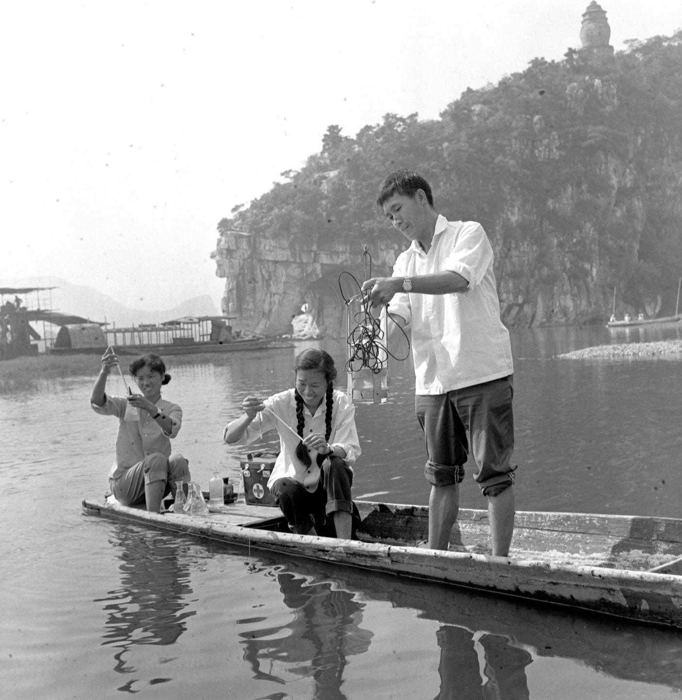 1979年,化验人员对漓江进行定期水质采样化验。