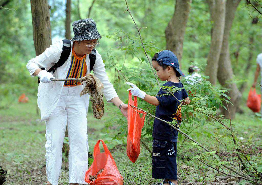 2008年9月1日,一名导游带着自己的儿子在九马画山景点捡垃圾。