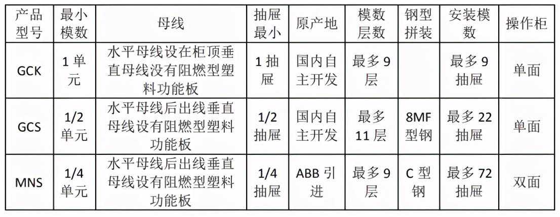 模数:GCK最小抽屉单元1模数:GCS最小抽屉单元1/2模数,MNS(进口ABB技术)最小抽屉单元1/4模数。母线:MNS和GCS的水平母线都是后出线与前左的抽屉单元、前右的电缆出线室有隔板隔开,他们的垂直母线是组装在阻燃型塑料功能板中更可靠。而GCK水平母线是设在柜顶上,垂直母线没有阻燃型塑料功能板,电缆出线可后出,也可做成右侧电缆室出线,但抽屉推进机构和GCS、MNS不同,比较简单。