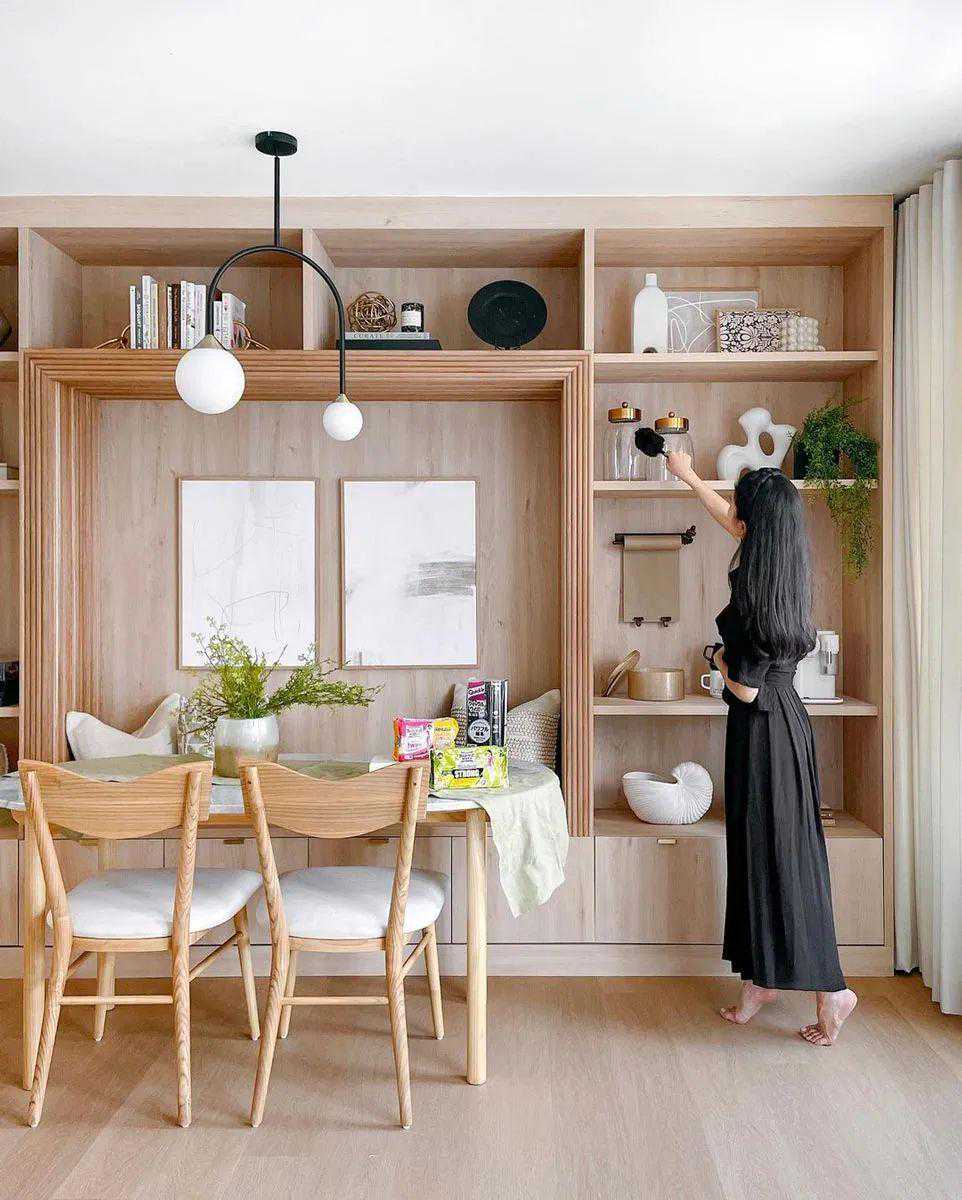 座位周围围绕开放式的搁板。这种内置设计不仅增加了存储空间,还提供了展现家居设计技巧的机会,特别适合小型住宅。