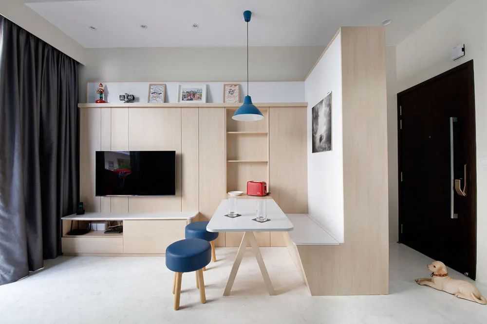 有一些小户型住宅放不下餐桌。在上图中,半高L型长椅作为厨房与客厅的分割,还围起了摆放餐桌的位置,长凳的靠背还可以作为岛台。