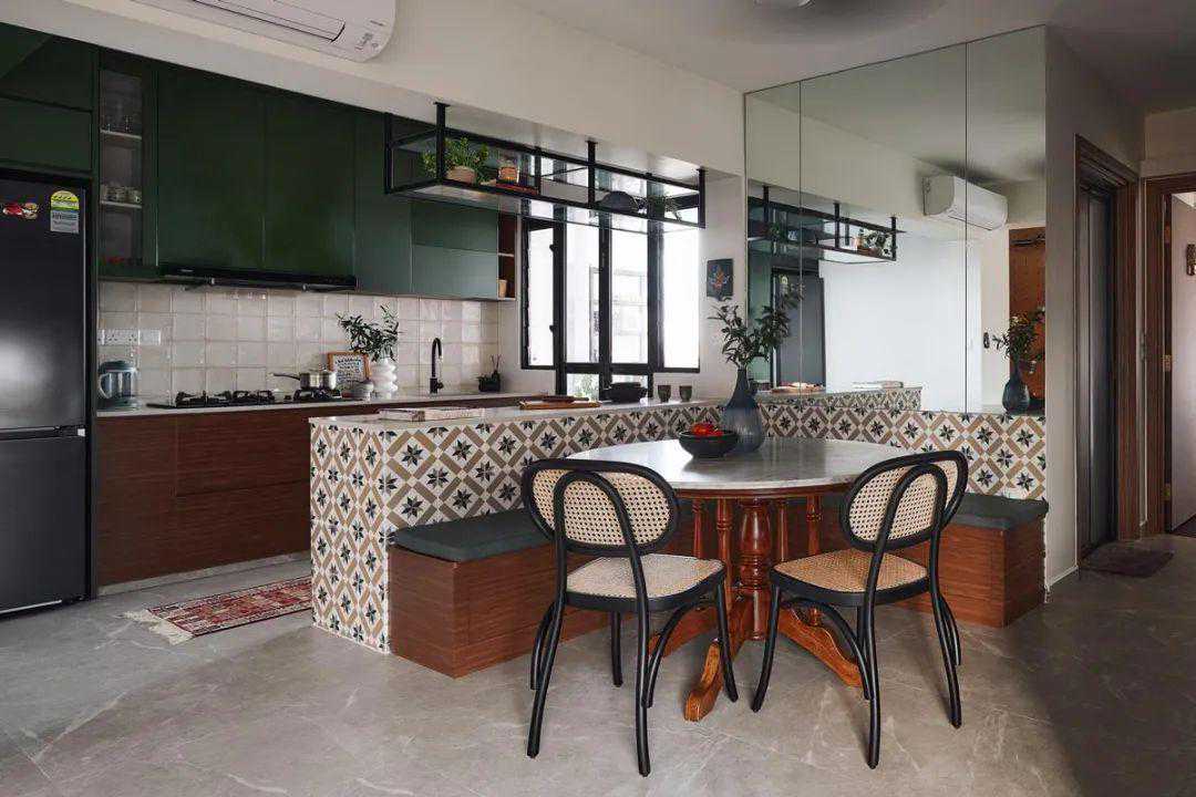 这个复古风格的用餐区看起来就像香港的一家茶餐厅,粉色的长椅与空间中的复古绿色相得益彰。