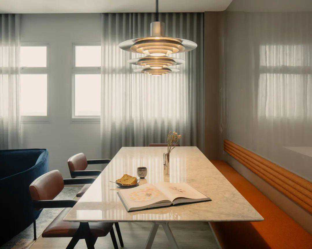 在上图中的餐厅里,橙色的座椅在整体中性色调中显得格外醒目,唤起了复古魅力的感觉,并与悬挂在上方的银色圆盘吊灯相得益彰。